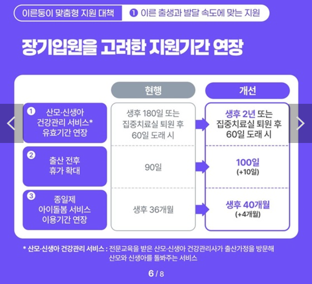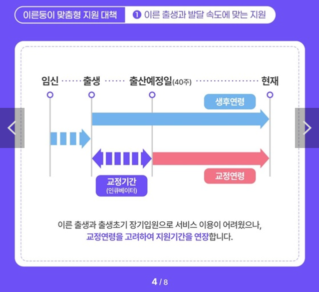 기존 지원은 출생일을 기준으로 제공되었으나, 이른둥이는 출생일이 이른 만큼 서비스 기간이 짧아지는 문제가 있었습니다. 이제 출생예정일 기준으로 산정해 필요한 서비스 제공 기간을 늘립니다.
