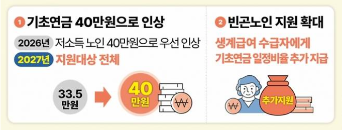 정부는 기초연금 지급액을 점진적으로 확대하여 소득 하위 40%에 해당하는 어르신들에게 2026년 부터 저소득 노인을 우선으로 월 최대 40만 원을 지급할 예정입니다.