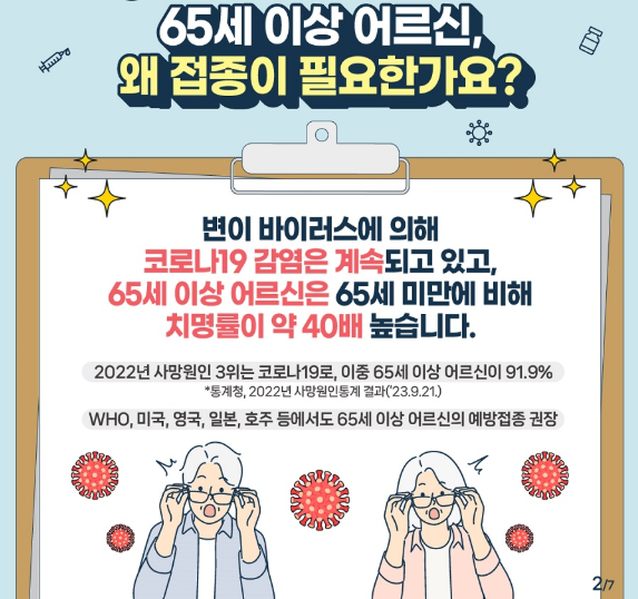 고령자 65세 이상(1959년 이전 출생자) 어르신은 무료 접종 대상입니다. 고령층은 코로나19 감염 시 중증으로 진행될 위험이 높기 때문에 우선 순위로 지정되었습니다.
