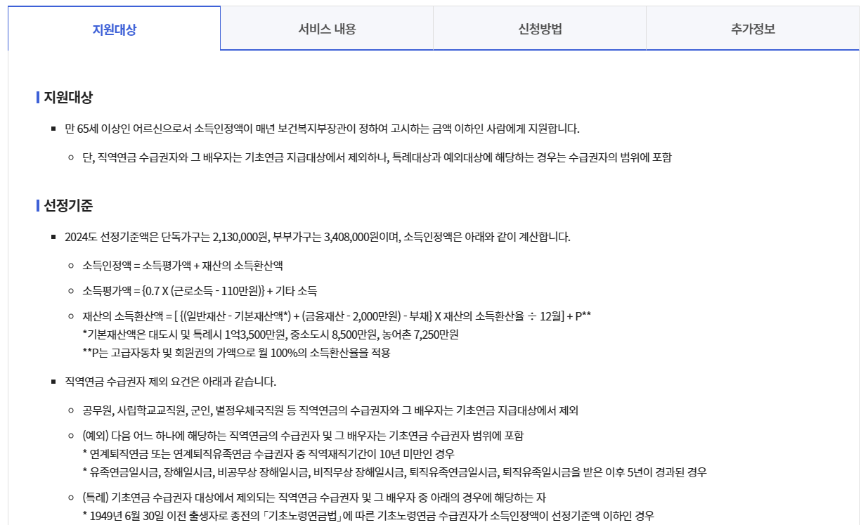 이는 어르신들의 안정적인 노후를 지원하고 빈곤 문제를 완화하기 위한 제도로, 근로소득, 연금소득, 재산 등을 고려한 소득인정액을 기준으로 수급 여부를 결정합니다.