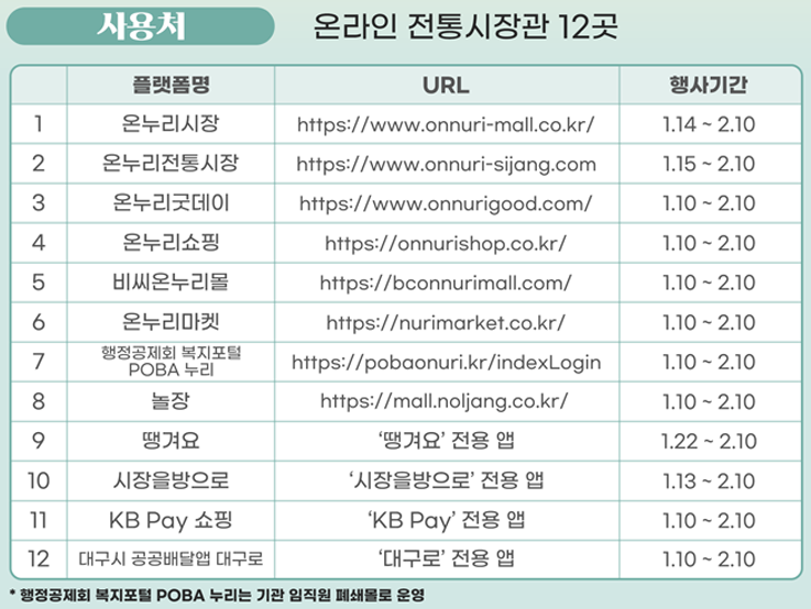 - 환급 15%와 온라인 전통시장관 할인쿠폰(5%)을 더하면 최대 35% 절약 가능.